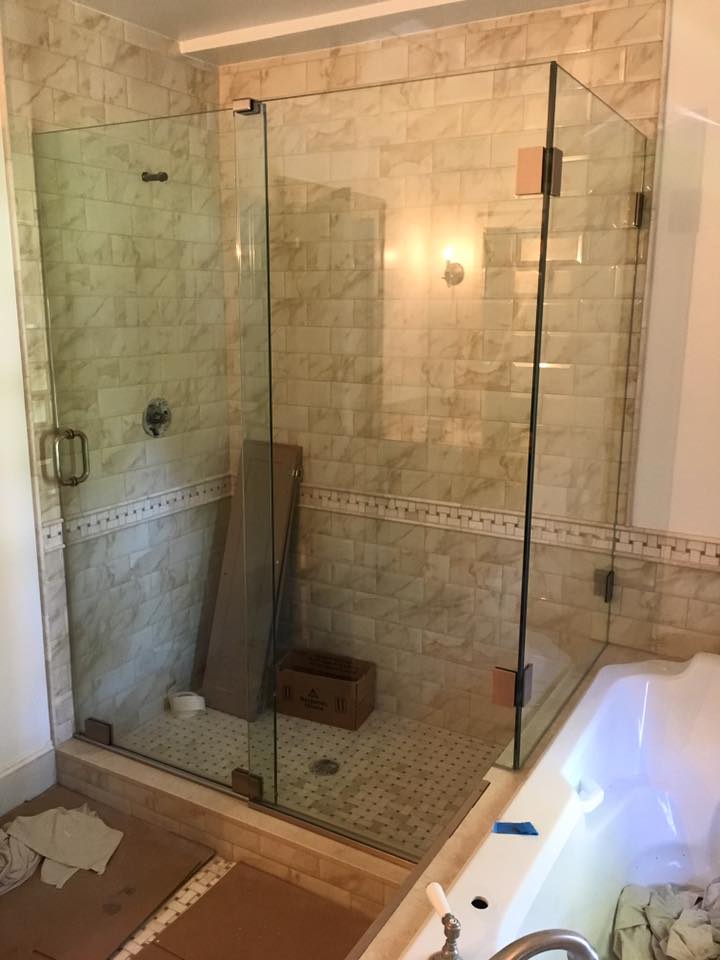 Published January 23, 2018 at 720 × 960 “Essence”/”Messina” headerless sliding shower enclosure, with a 90degree return.