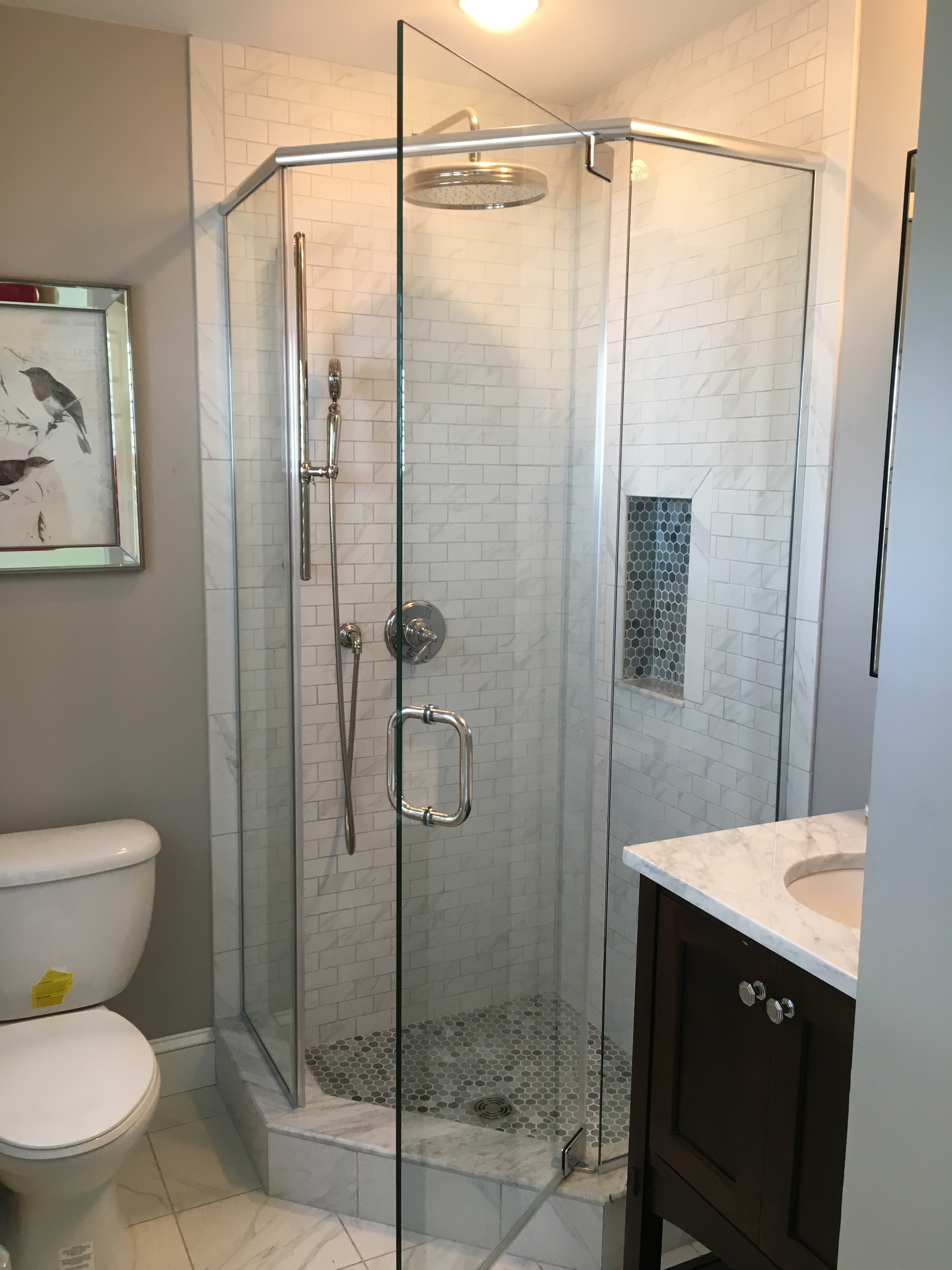 neoangle Published January 23, 2018 at 3024 × 4032 Neo-angle “frameless” shower enclosure with 3/8″ clear glass.