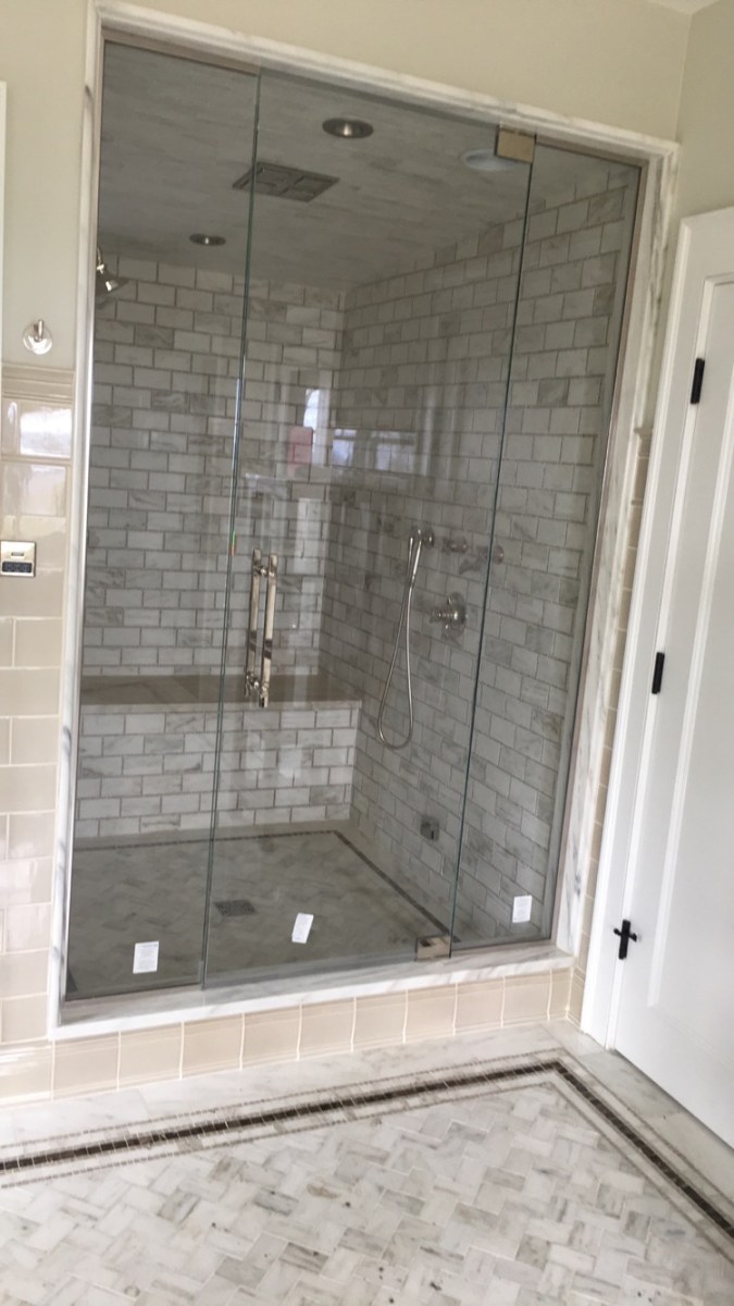 IMG_9579 Published January 23, 2018 at 750 × 1334 Steam shower enclosure – door with top and bottom pivots flanked by panels secured with polished chrome channel (1/2″ low-iron / “ultrawhite” glass with Showerguard).