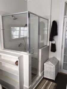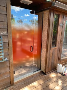 - An outdoor shower with custom-printed glass to provide privacy.
