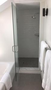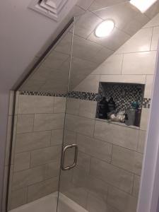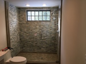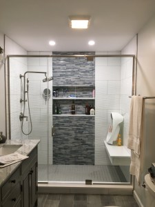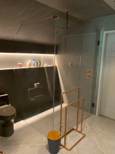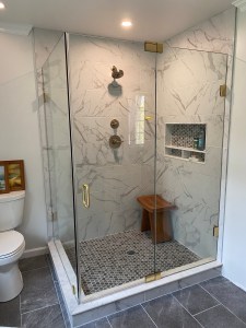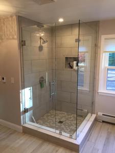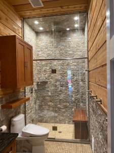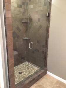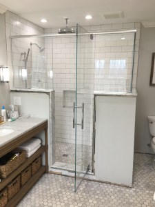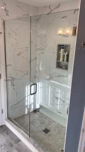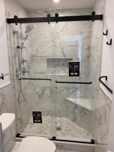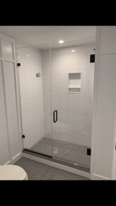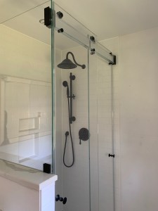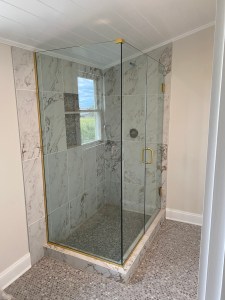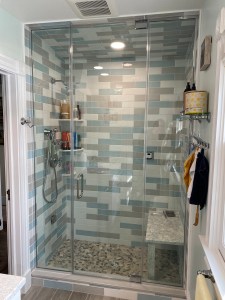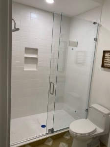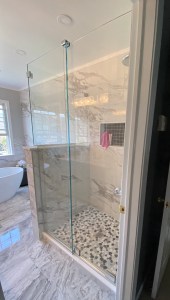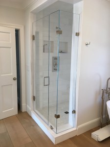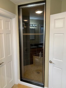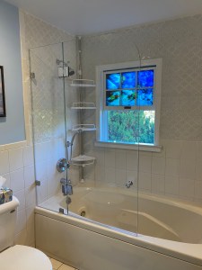 - Door & panel enclosing a client’s shower/bathtub area.