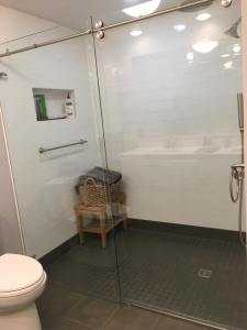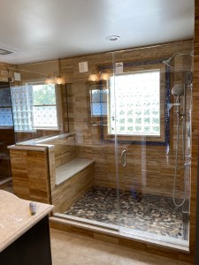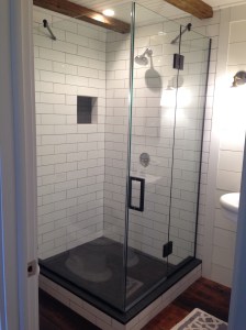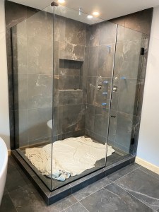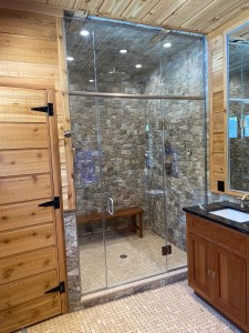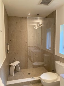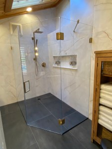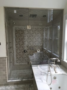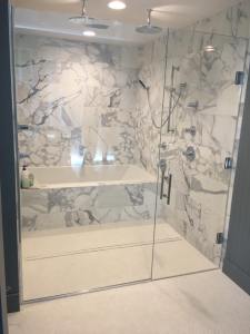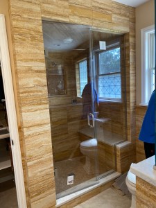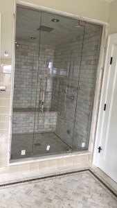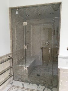 - Custom steam shower configuration based on architect’s design, with a notched panel held in place with channel and clamps, and door mounted on the panel with glass-to-glass hinges (1/2″ low-iron/ “ultrawhite” glass with Showerguard coating).