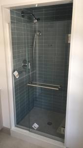 - A “French door” shower enclosure, designed to be wheelchair/walker-accessible.