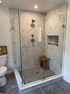 IMG-5241 Previous Next Published July 19, 2023 at 3024 × 4032 in Shower Enclosures Fixed panel, door, and 90 degree return using wall clamps and glass-to-glass pivots. Like Loading...